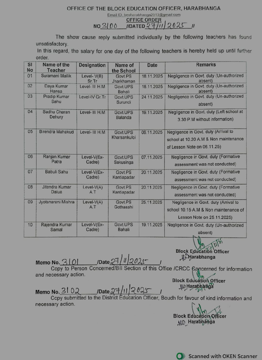 A formal office order issued by Harabhanga BEO Hadibandhu Behera on November 27 listed the names of the erring teachers along with specific violations observed during the unannounced visits.