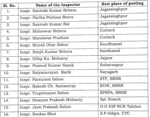 The Police Commissionerate, Bhubaneswar-Cuttack, issued a personnel order relieving 16 Inspectors from their current postings to join new assignments across the state.