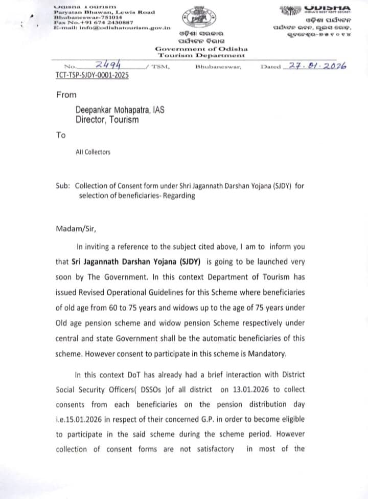 The Tourism Department has directed all district collectors to personally monitor and expedite the collection of consent forms under the Shri Jagannath Darshan Yojana (SJDY).