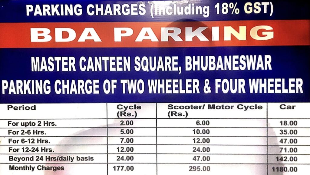 The Bhubaneswar Development Authority (BDA) announced revised parking charges at Master Canteen Square, covering cycles, scooters, motorcycles, and cars. The new tariff includes 18% GST.