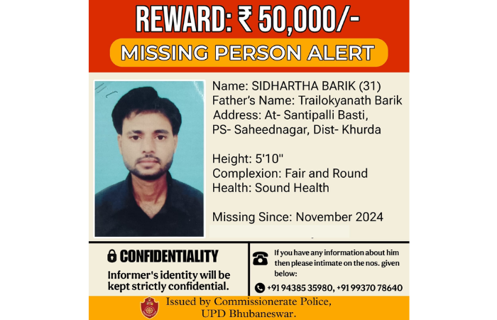 Bhubaneswar police have announced a ₹50,000 reward for any credible information that may help locate Sidhartha Barik, a 31-year-old man who went missing in November 2024.