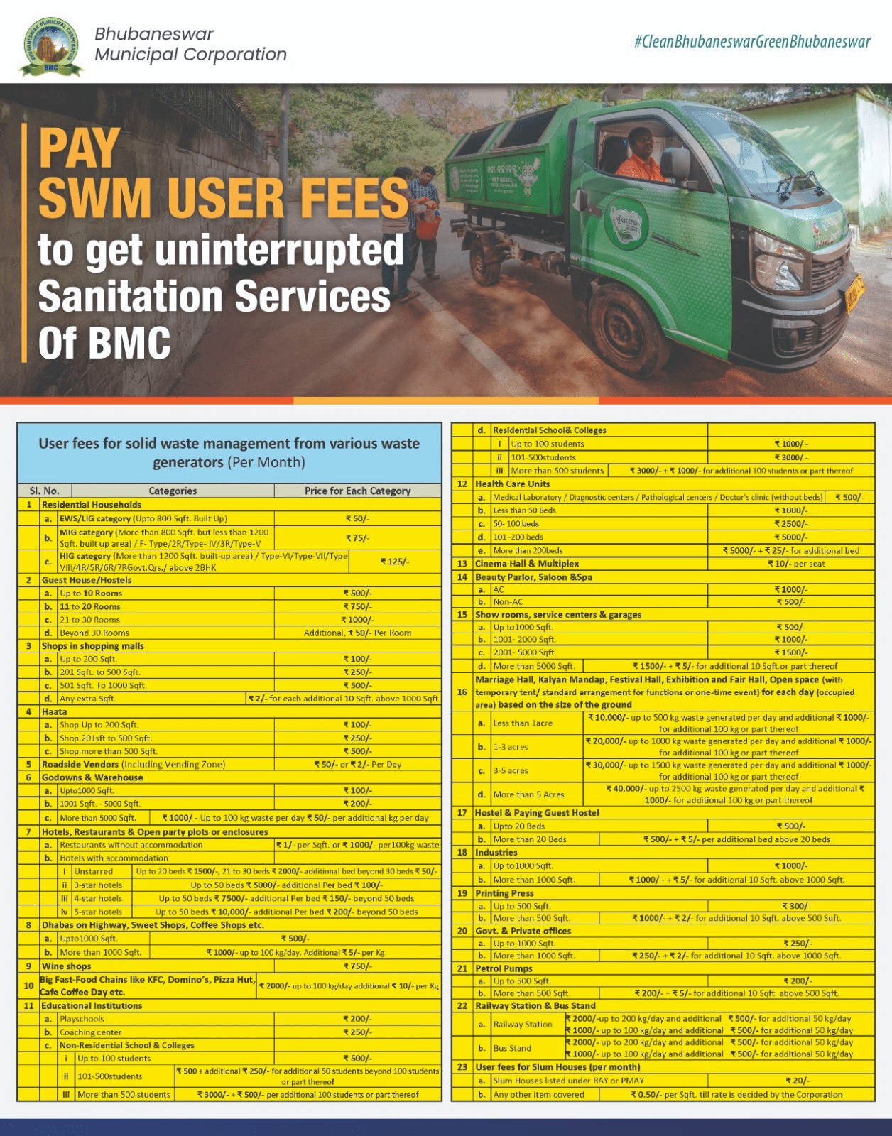 In a move aimed at enhancing waste management services and funding cleanliness initiatives, the Bhubaneswar Municipal Corporation (BMC) has announced the implementation of a monthly user fee for garbage collection from households and commercial establishments.
