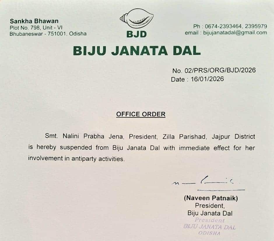 In a separate order, Nalini Prabha Jena, President of Zilla Parisad, Jajpur, was also suspended from the party with immediate effect. This directive was signed by BJD President Naveen Patnaik.