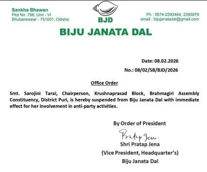 According to the official office order dated February 8, 2026, the suspension was issued under reference number 08/02/SB/BJD/2026. The party cited her involvement in anti-party activities as the reason for disciplinary action.