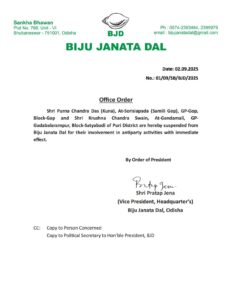 The suspension order, issued by Shri Pratap Jena, Vice President (Headquarters) of BJD, names Purna Chandra Das (Kuna) of Sorisipada (Samili Gop) under Gop block and Krushna Chandra Swain of Gendamali under Satyabadi block.