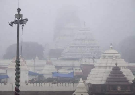 The coastal town of Puri experienced an unusual and striking weather phenomenon as dense fog completely enveloped the holy city. The iconic Shree Jagannath Temple was almost entirely obscured, with the temple spire and the sacred Neelachakra flag atop the Badadeula remaining invisible for a considerable period.