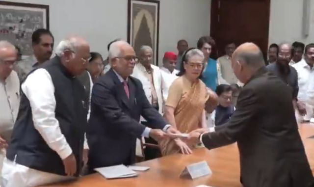 The former Supreme Court judge filed his nomination papers today in the presence of senior Congress leaders, marking a moment of ideological assertion by the opposition bloc.