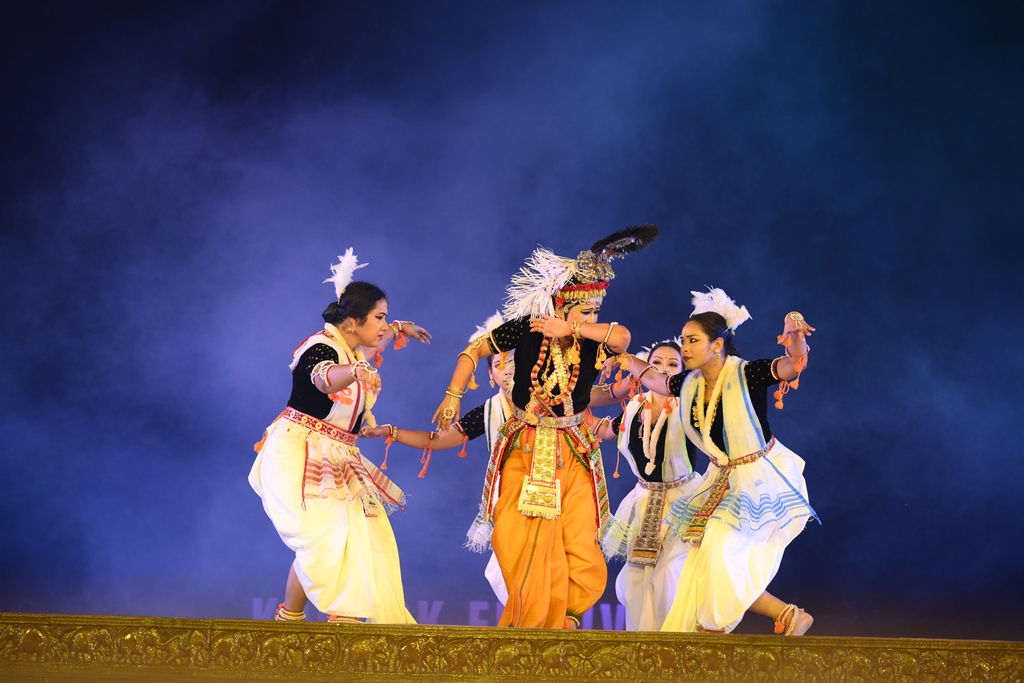 The evening began with a soulful presentation of Manipuri dance by the artists of Bimbavati Devi’s Manipuri Dance Theatre, Kolkata. Smt. Bimbavati Devi, a distinguished exponent with decades of experience, brought forth Lilakamla, a composition inspired by the traditional Gosthali dance, originally created by legendary musician Guru Bipin Singh. The performance depicted the heroic episodes from the life of Lord Krishna, seamlessly blending dance, rhythm, and music rooted in the Vaishnava traditions of Manipur. The choreography, designed by Smt. Bimbavati Devi, offered an immersive experience for the audience.