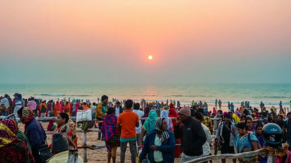 Devotees hold a deep belief that bathing at Chandrabhaga on Magha Saptami helps cleanse families of disease, sorrow, and fear. Many pilgrims observed traditional customs by staying overnight in temporary huts at the Chandrabhaga fairground, cooking meals in earthen pots, and breaking the pots as part of the ritual observance. After an overnight vigil, devotees gathered at dawn to take the holy dip and offer prayers during sunrise.