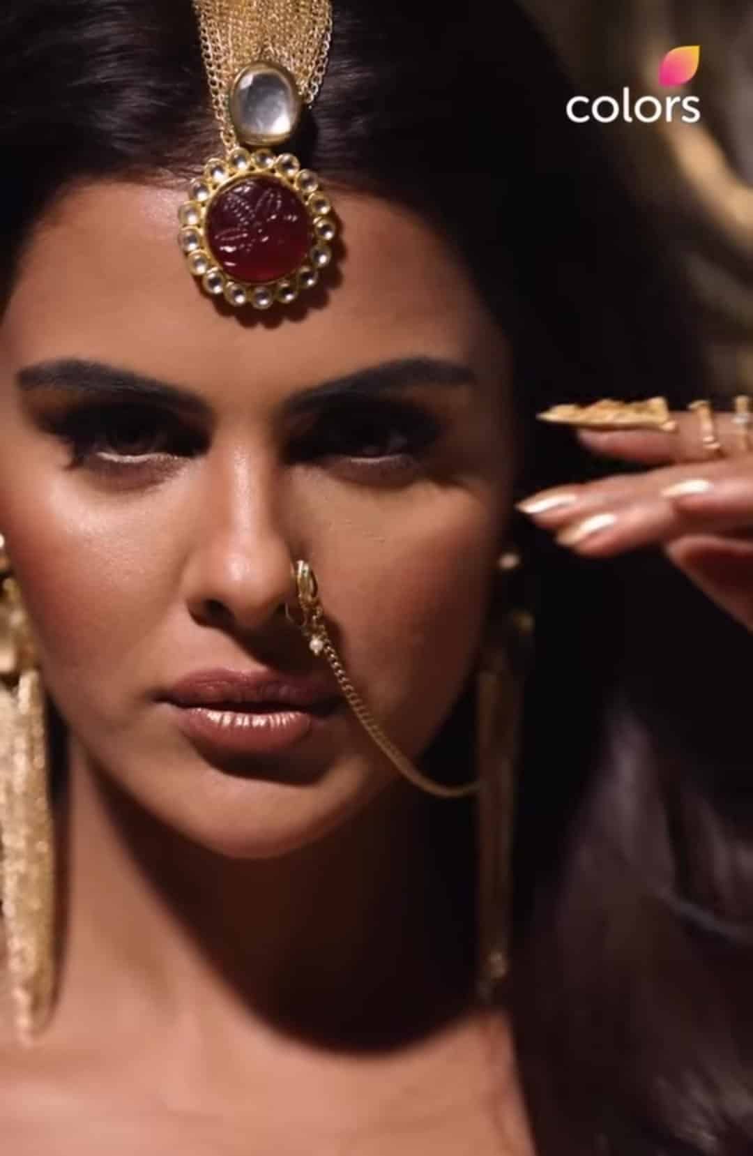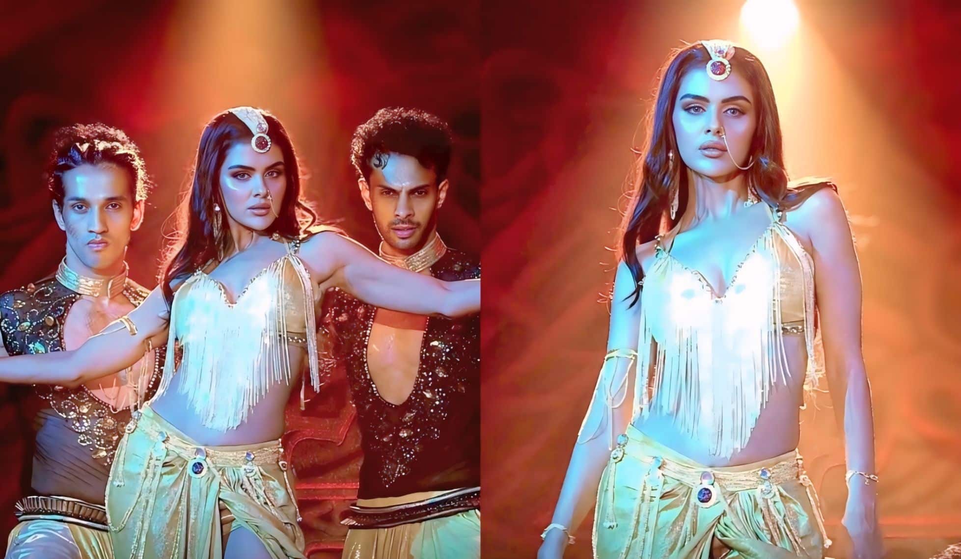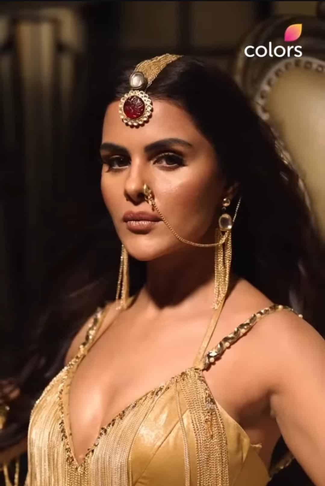 Priyanka Chahar Choudhary’s character dons a golden-themed ensemble, including a skirt with gathered details and a slit, paired with a golden bralette, fringes, and matching accessories — evoking a mythical, folklore-inspired look reminiscent of past Naagins like Mouni Roy, Tejasswi Prakash, and Surbhi Jyoti.