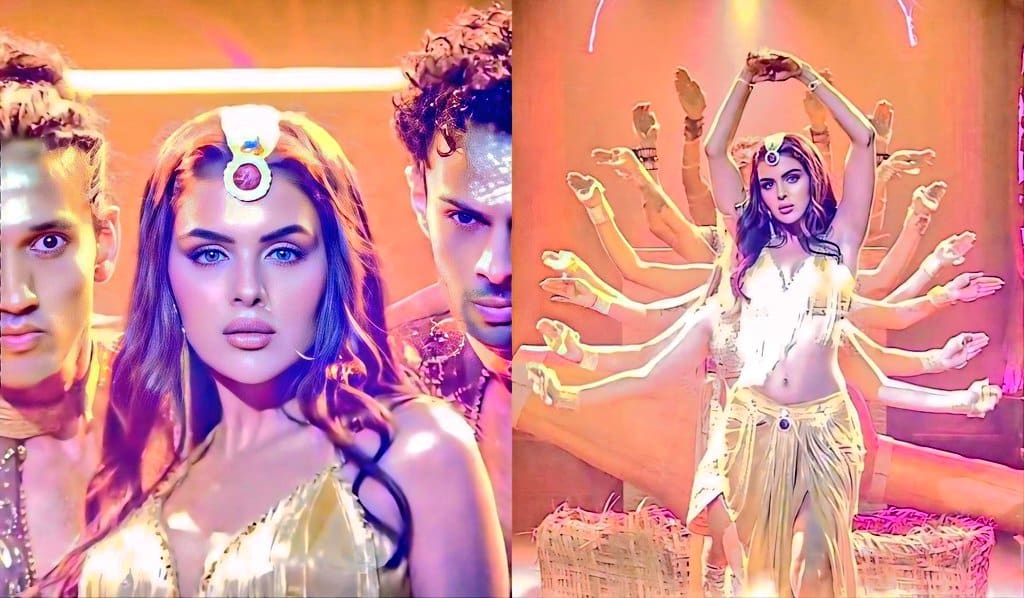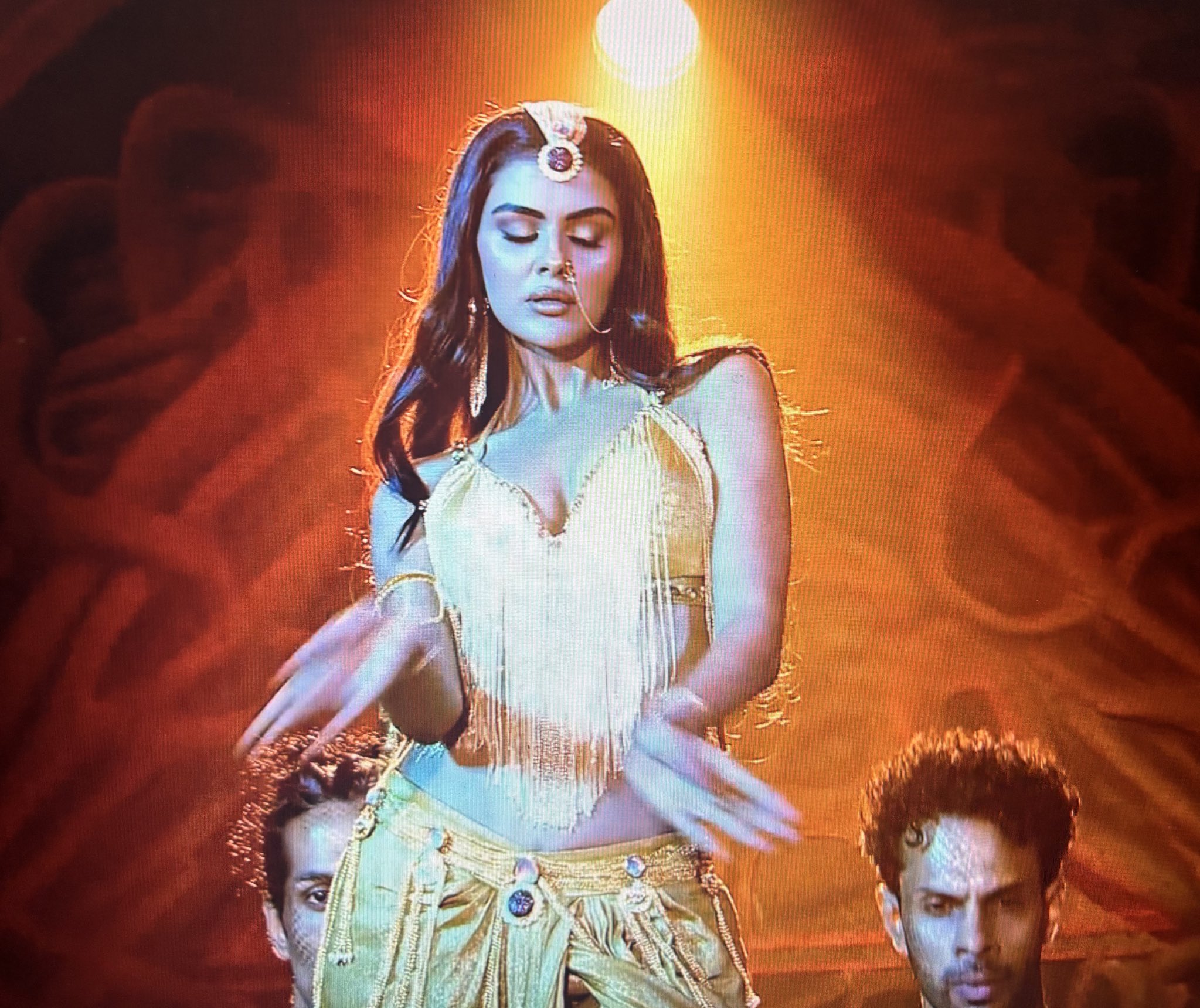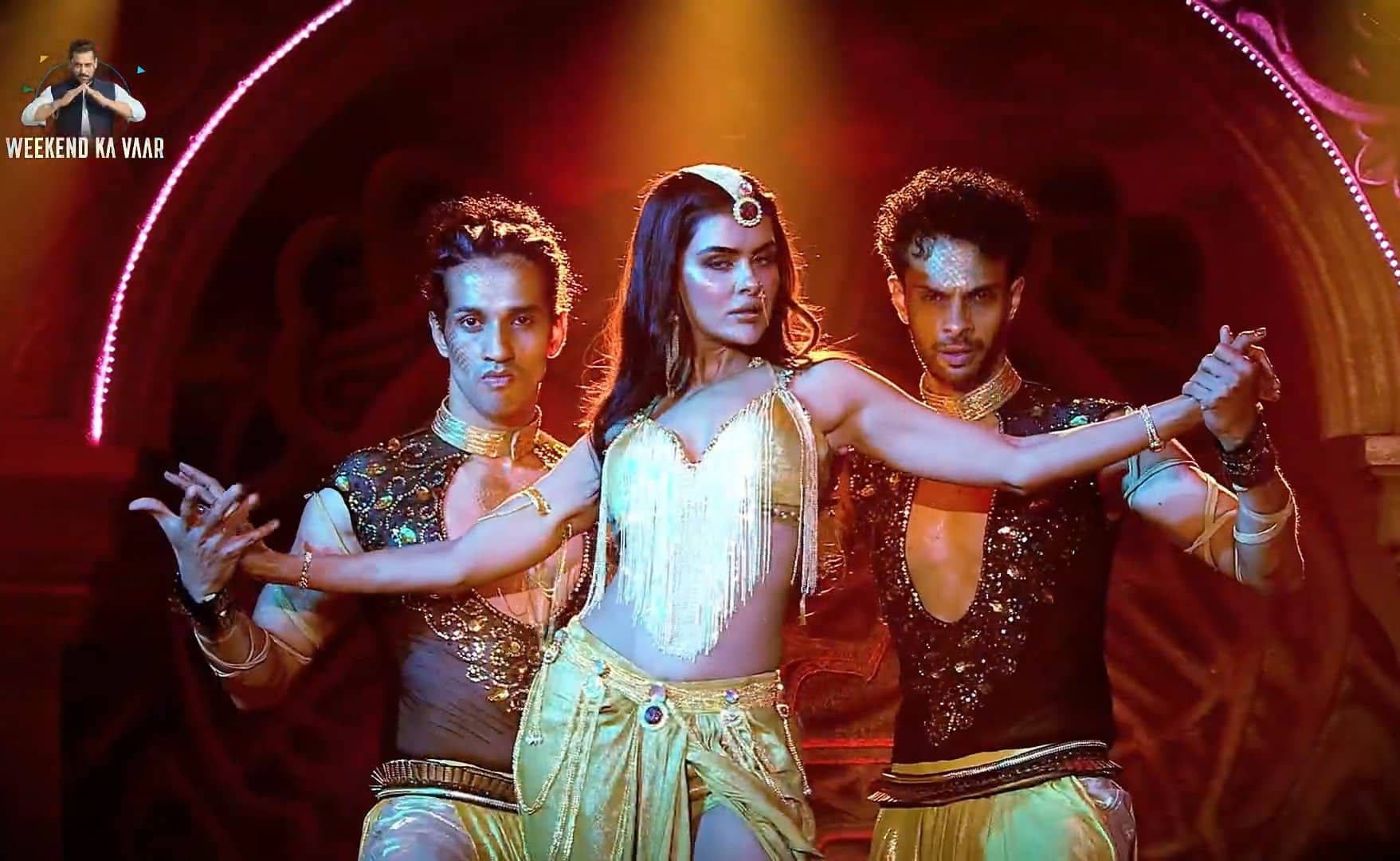 Priyanka Chahar Choudhary’s character dons a golden-themed ensemble, including a skirt with gathered details and a slit, paired with a golden bralette, fringes, and matching accessories — evoking a mythical, folklore-inspired look reminiscent of past Naagins like Mouni Roy, Tejasswi Prakash, and Surbhi Jyoti.