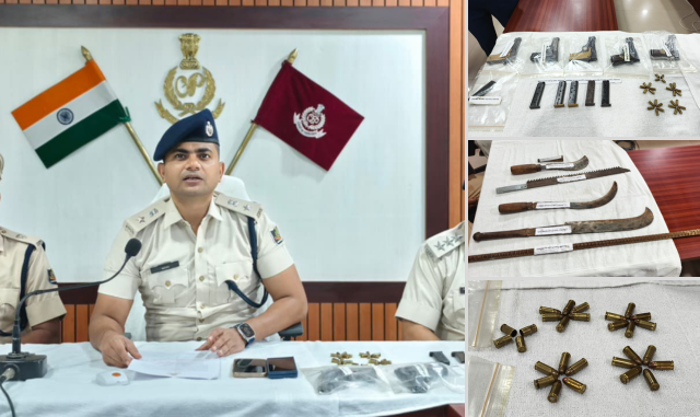 Police seized five pistols, seven magazines, 25 live rounds, fired cartridges, two swords, two “katuris,” an iron rod, a black Mahindra Thar (OD 02 BR 7001), and incriminating items like beer bottles, chillams, and cigarette butts.