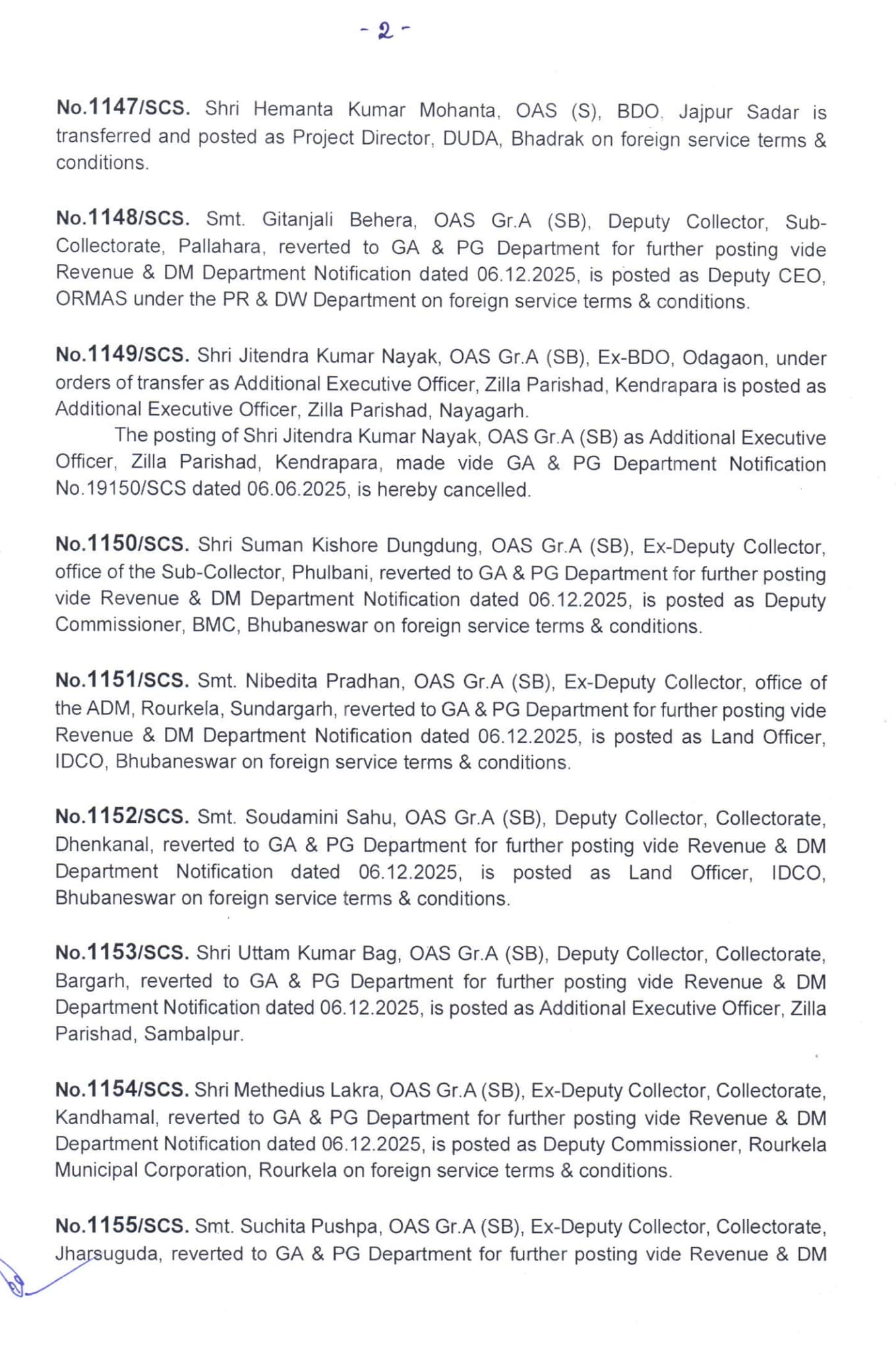 - Rajendra Kumar Ranjit, OAS (SAG), previously serving as Additional Commissioner for Settlement and Consolidation in the Office of RDC (CD), Cuttack, has been transferred and posted as CDO-cum-EO, Zilla Parishad, Gajapati.
