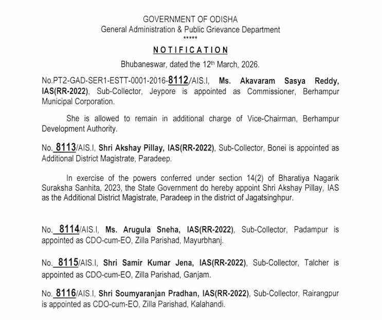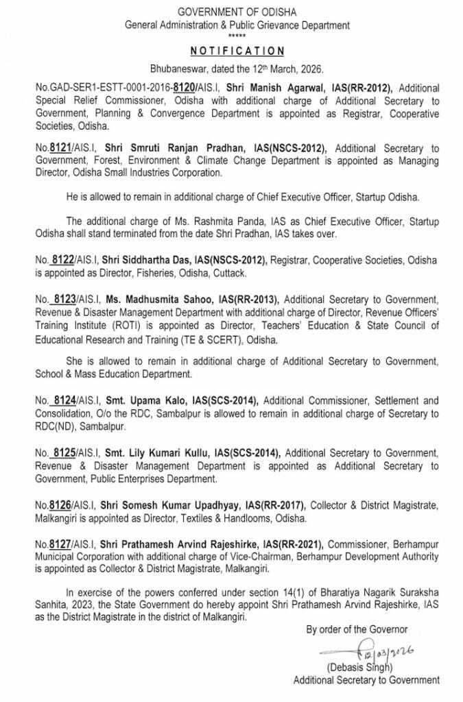 The Odisha Government announced a significant reshuffle in the IAS cadre, transferring several senior officers and assigning them new responsibilities.
