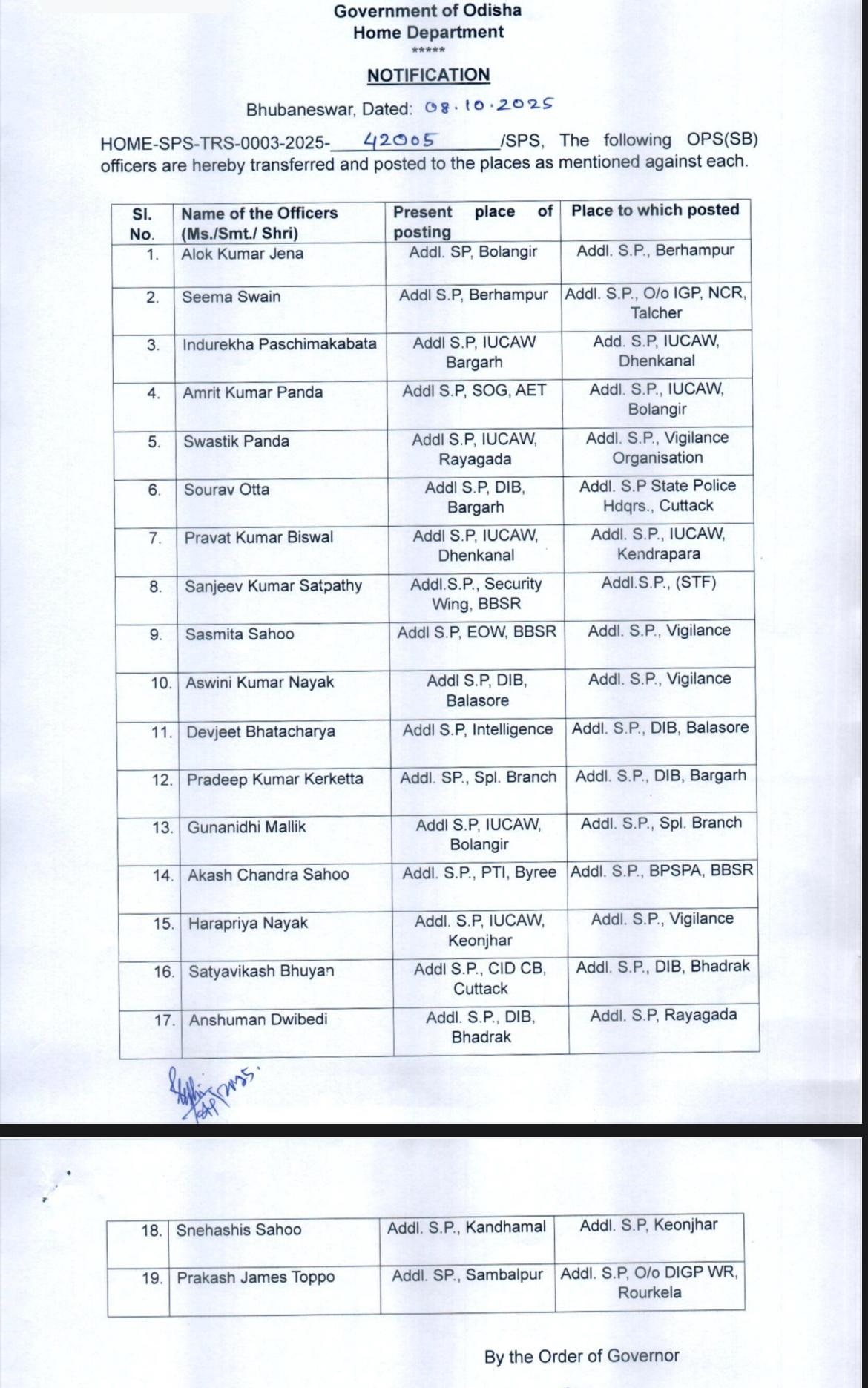 The Odisha Home Department has issued a notification transferring 19 OPS(SB) officers to new postings across the state.