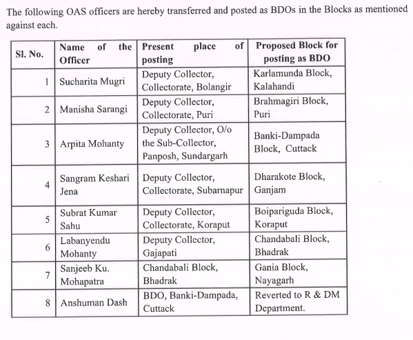 The Odisha government has transferred eight Odisha Administrative Service (OAS) officers to new postings as Block Development Officers (BDOs).