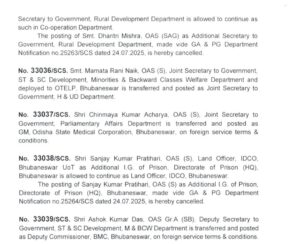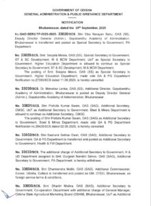 The Government of Odisha’s General Administration & Public Grievance Department has issued a comprehensive notification announcing a series of transfers and postings of senior officers from the Odisha Administrative Service (OAS).