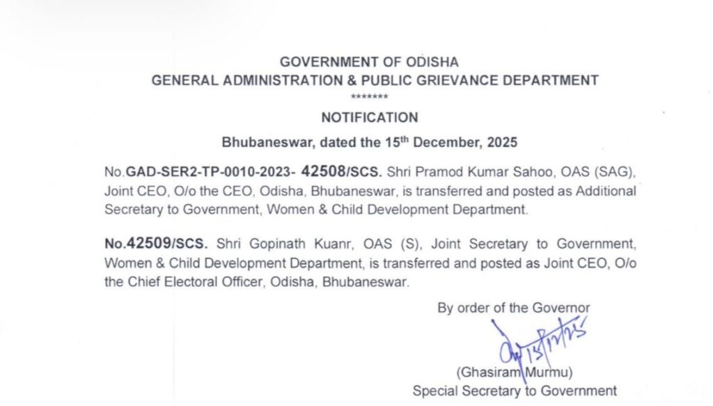 Firstly, the government transferred Shri Pramod Kumar Sahoo, OAS (SAG), who was serving as Joint CEO in the Office of the Chief Electoral Officer, Bhubaneswar. He now takes charge as Additional Secretary to the Government, Women & Child Development Department.
