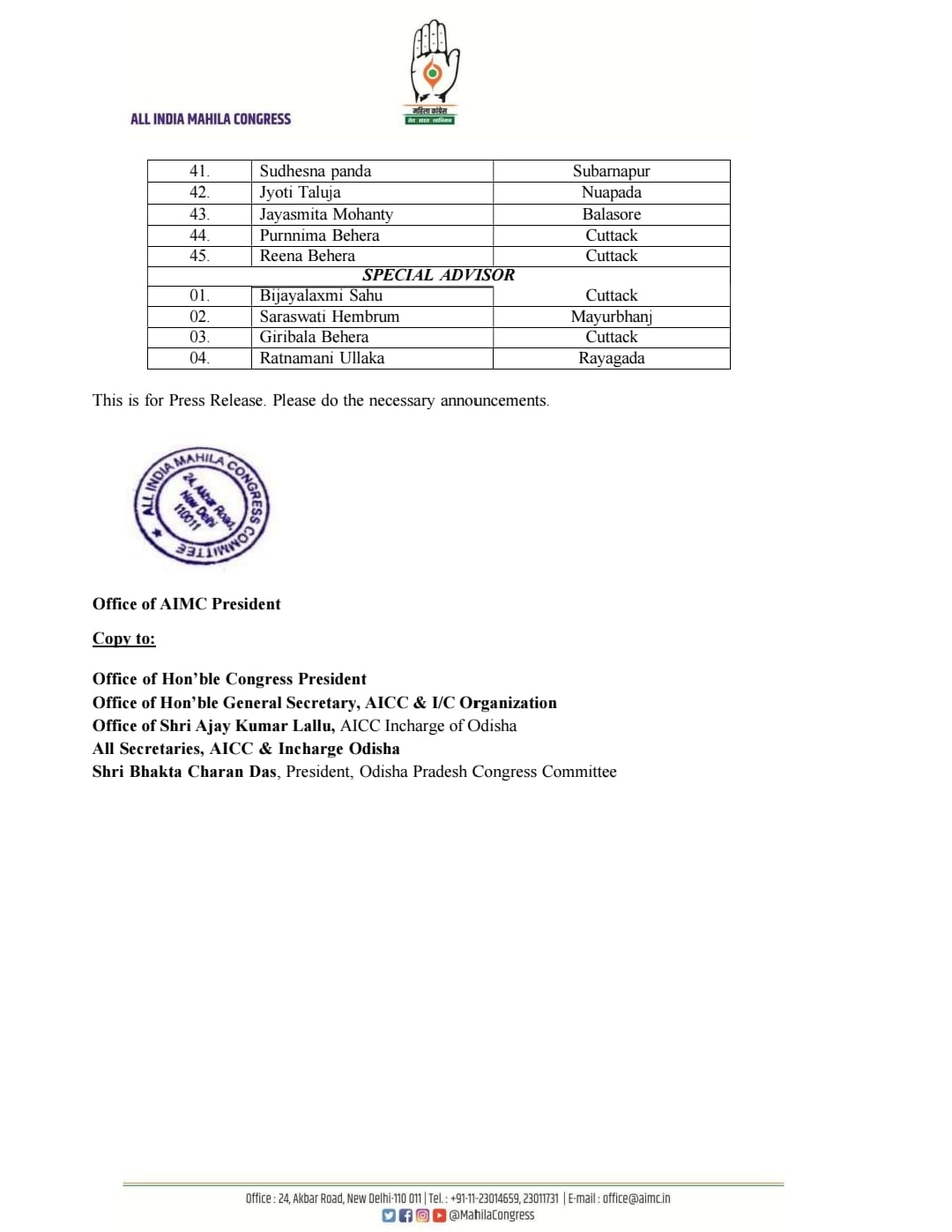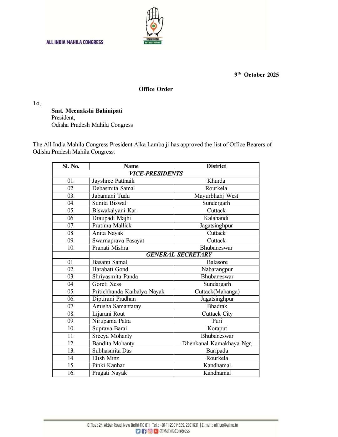In a move to strengthen the women’s wing of the Congress party in Odisha, All India Mahila Congress Committee President Alka Lamba has approved and announced the newly constituted Odisha State Mahila Congress Committee.