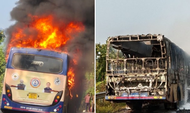 An OSRTC bus traveling from Visakhapatnam to Jeypore caught fire at Salur Ghat on the Odisha-Andhra border, leaving the vehicle completely gutted.