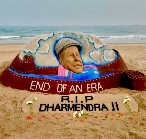 The sand art features the heartfelt message, “RIP Dharmendra Ji, End of an Era,” symbolizing the nation’s collective respect for the beloved actor. Sharing the artwork on his X handle, Pattnaik wrote: