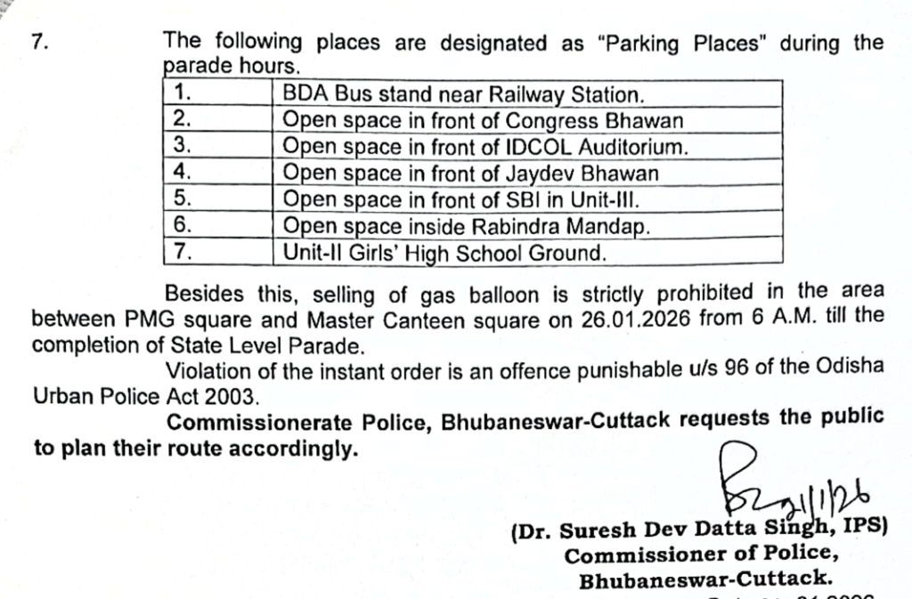 Authorities also banned the sale of gas balloons between PMG Square and Master Canteen Square on January 26 from 6 AM until the parade concludes. Violation of this order constitutes an offence under Section 96 of the Odisha Urban Police Act 2003.