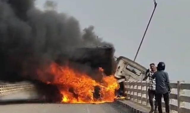 The truck lost balance and rammed into the side wall of the bridge. As a result, the engine caught fire, which gradually spread and engulfed the entire vehicle. The truck was reportedly transporting coal to JSW Company in Sahajbahal when the mishap occurred.