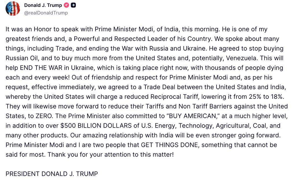Wonderful to speak with my dear friend President Trump today. Delighted that Made in India products will now have a reduced tariff of 18%. Big thanks to President Trump on behalf of the 1.4 billion people of India for this wonderful announcement.