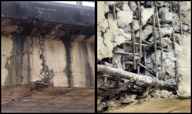 The damage is clearly visible from the bridge’s edge, where the concrete has broken away, revealing the internal steel framework. The situation has prompted urgent calls for repair and reinforcement, as well as increased focus on alternative road connectivity to ensure uninterrupted travel.